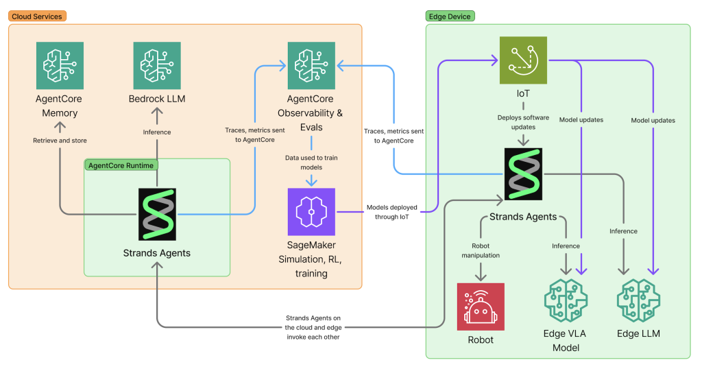 The cloud enables additional capabilities that are infeasible at the edge. AgentCore Memory can maintain spatial and temporal context spanning hours or days, remembering not just what happened but where and when. Learnings can be gathered and applied across entire fleets instead of siloing to individual devices – when one robot discovers a better approach, that knowledge becomes available to all robots through shared memory. Distributed observability across entire fleets provides the ability to understand what AI agents and robots are doing when deployed at scale, offering insights that no single device could generate. Amazon SageMaker enables massive parallel simulation and training of models, allowing organizations to apply learnings from real-world and simulated deployments back into improved models that benefit the entire fleet.