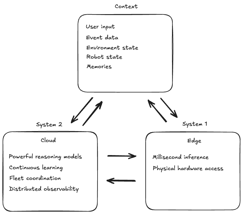 Physical AI applications reveal a tension that shapes how we architect intelligent systems. Consider a robotic arm catching a ball. The moment between seeing the ball and adjusting the gripper position must happen in milliseconds. Network latency to a cloud service, even with the fastest connections, makes this impossible. The inference must happen at the edge, on the device itself, with the near-instantaneous response times that physical reality demands. Yet that same robotic system benefits immensely from cloud capabilities. Planning a multi-step assembly task, coordinating with other robots, or learning from the collective experience of thousands of similar robots requires the computational scale that only the cloud provides. Models like Anthropic’s Claude Sonnet 4.5 bring reasoning capabilities that transform how robots understand and execute complex tasks, but they’re too large to run on edge hardware. This mirrors Daniel Kahneman’s System 1 and System 2 thinking – the edge provides fast, instinctual responses while the cloud enables deliberate reasoning, long horizon planning, and continuous learning. The most capable physical AI systems use both, working together seamlessly.