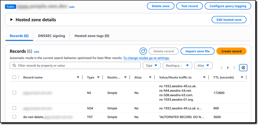 We went ahead and purchased the domain. It automatically creates a Route 53 hosted zone in your AWS account. Per Amazon Route 53 documentation, a hosted zone is a container for records, which includes information about how you want to route traffic for a domain (such as example.com) and all of its subdomains (such as www.example.com, retail.example.com, and seattle.accounting.example.com). A hosted zone has the same name as the corresponding domain.