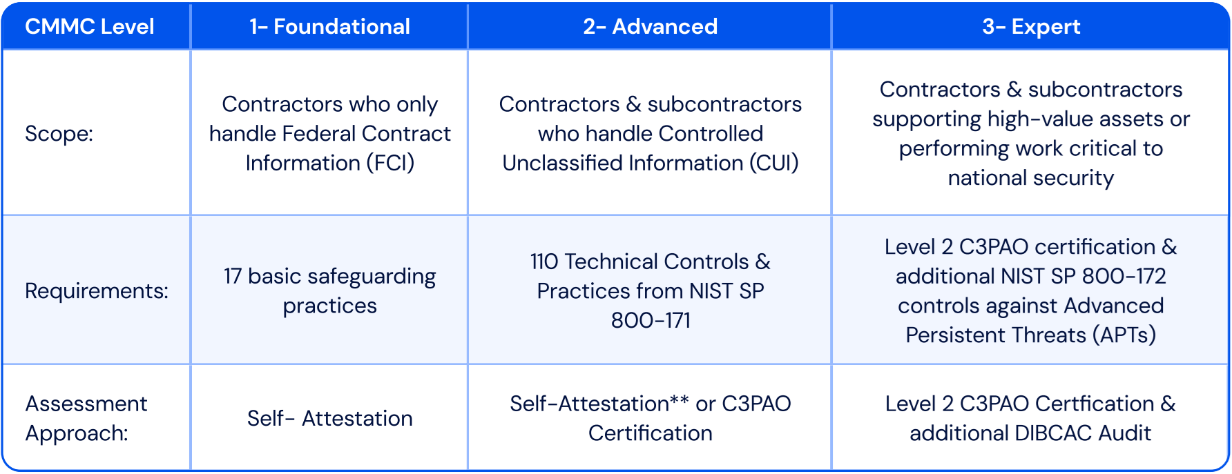 The following table outlines the scope, requirements, and assessment approach of the three levels.