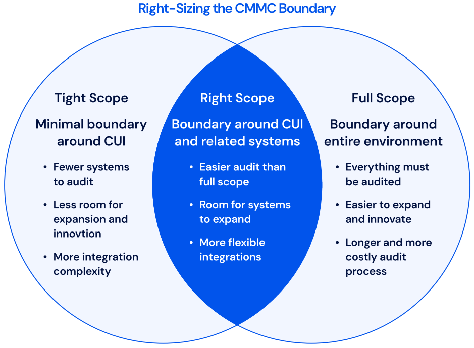 This balance—security with agility—is essential for government contractors and subcontractors working with tight budgets and timelines. The following Venn diagram illustrates the intersection between a tight scope with a minimal boundary and a full scope that puts a boundary around everything. The center area, showing the overlap between tight and full scopes, lists some advantages of placing the CMMC assessment boundary around CUI and related systems.