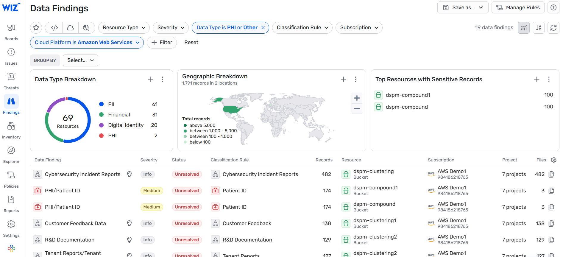Figure 2: Wiz automates data findings through its integrated DSPM capabilities to help identify where data resides and prioritize remediation of detected security risks