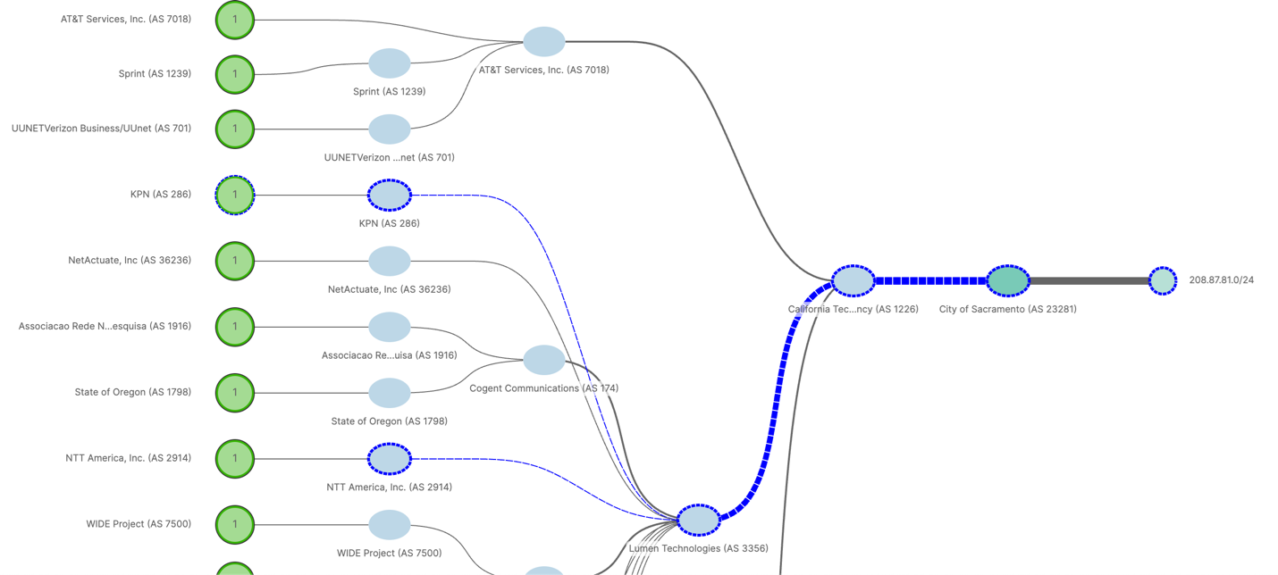The following network map visualizes BGP (Border Gateway Protocol) routing paths at Layer 3, showing how traffic flows between different autonomous systems and network endpoints.