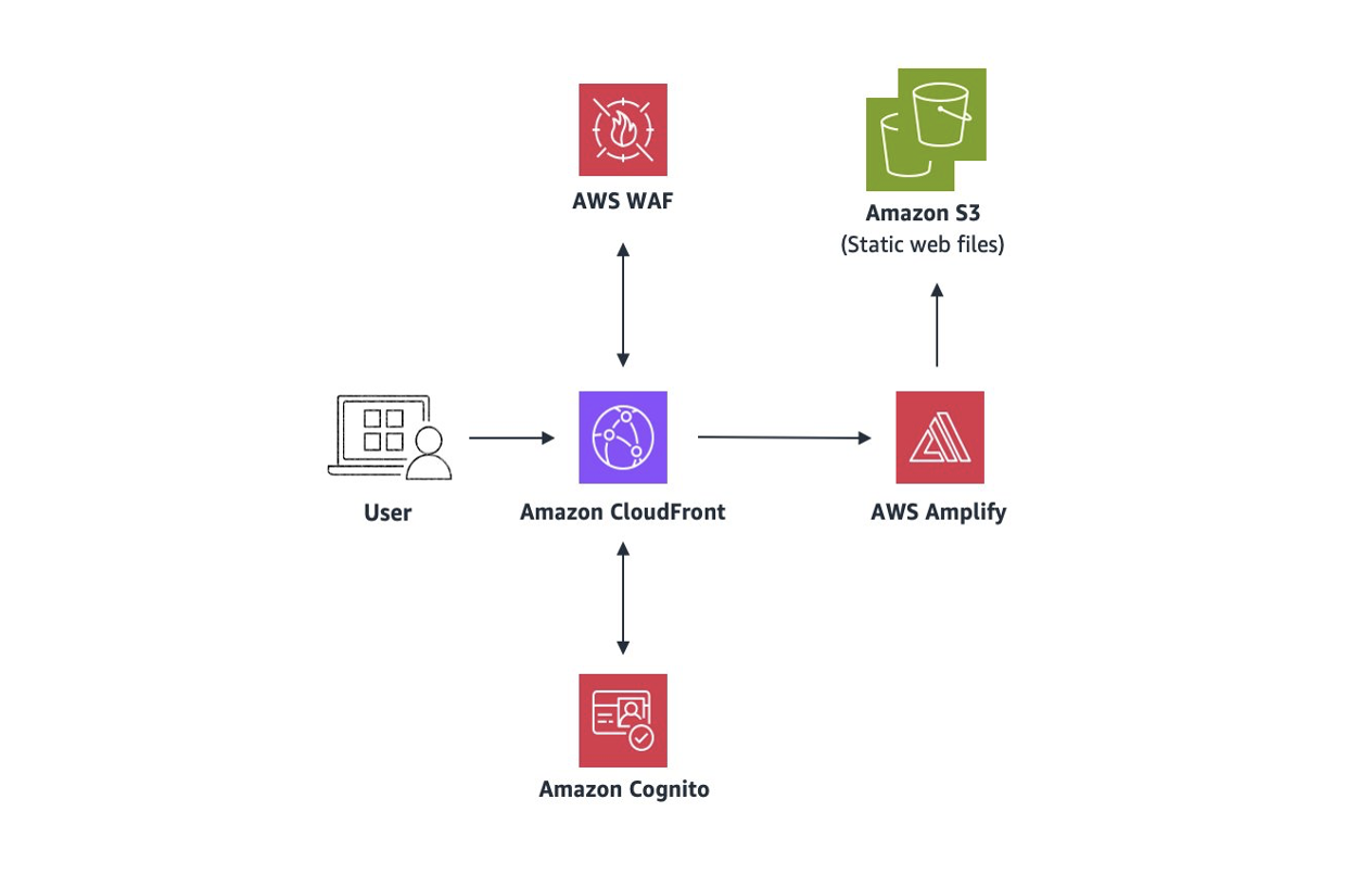 Users access the website through Amazon CloudFront, which accelerates content delivery, and AWS Web Application Firewall (WAF) provides protection against web exploits and bots. Amazon Cognito manages user authentication and authorization, segregating regular and admin users to provide appropriate access control. The React-based front end uses the AWS Amplify library, with static assets stored in Amazon Simple Storage Service (Amazon S3) for efficient rendering. This setup allows for a secure and responsive user interface. The Amplify client application communicates with backend services through Amazon API Gateway, facilitating seamless client-server interactions.