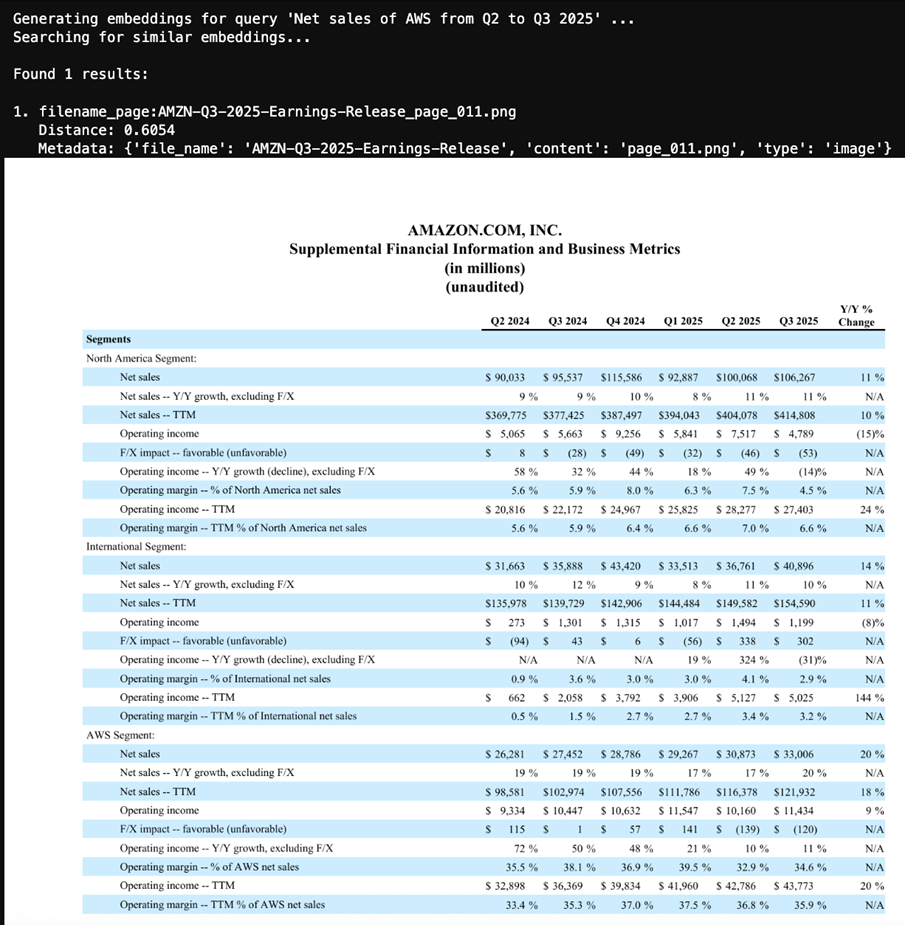 You can query cross-modal search with text and find relevant content, graphs, and tables from documents. In this post, we input the search query in text form to retrieve the image stored in S3 Vectors. You need to pass GENERIC_RETRIEVAL in embedding. This purpose parameter is optimized for searching an index repository containing a mixture of modality embeddings such as images and audio. If you design the index to have only DOCUMENT_IMAGE, you can choose to use DOCUMENT_RETRIEVAL instead. The following code snippet shows how to generate the embedding vector for retieval from user text input, query the S3 Vectors, and show the queried document image results: