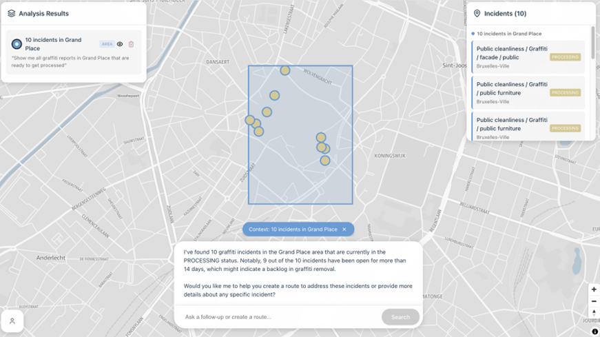 Agent response: “I’ve found 10 graffiti incidents in the Grand Place area that are currently in the PROCESSING status. Notably, 9 out of the 10 incidents have been open for more than 14 days, which might indicate a backlog in graffiti removal. Would you like me to help you create a route to address these incidents or provide more details about any specific incident?”