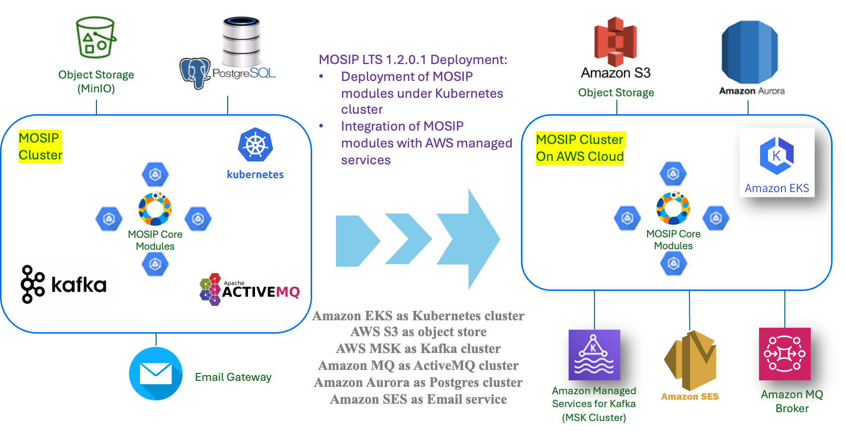 In the following figure, we demonstrate the implementation of the MOSIP POC on AWS including the difference in architecture and migration of components from on-premises to the new cloud-centered deployment.