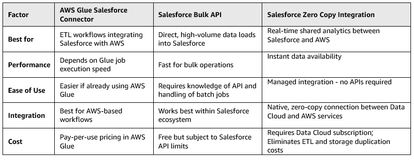 Recently, Salesforce and AWS introduced a third approach, Zero Copy ETL, which eliminates the need for traditional ETL or bulk upload processes altogether. This approach enables Salesforce Data Cloud and AWS storage services such as S3 to share and access the same datasets. While the AWS Glue connector offers ease of use within AWS Glue ETL pipelines and the Bulk API offers flexibility for developers managing high-volume data operations, the Zero Copy Integration focuses on seamless data access between platforms. The choice depends on the specific use case: AWS Glue is preferable for AWS based workflows, Bulk API is better for large-scale, independent Salesforce data operations, and Zero Copy Integration for real-time cross-cloud analytics and AI enablement. These factors are listed in the following tables.