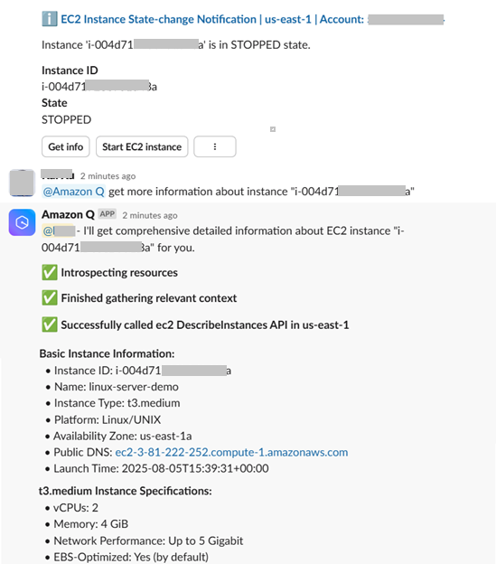 The following figure demonstrates how you can interact with Amazon Q Developer to respond to notifications. In this example, when an alert about a stopped Amazon Elastic Compute Cloud (Amazon EC2) instance appears in the channel, team members can use natural language queries to prompt Amazon Q Developer to investigate the incident. By engaging with Amazon Q Developer through natural language queries, you can quickly gather relevant data, receive actionable insights, and streamline your incident response process.