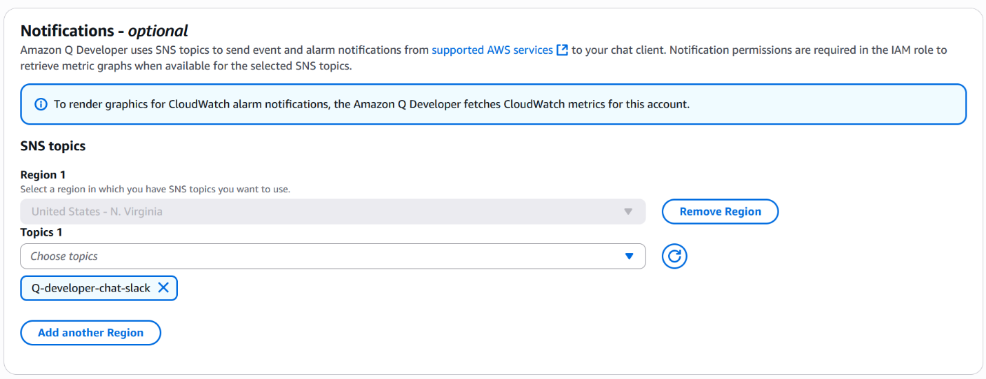 - In the Notifications section, add SNS topics. These topics can be integrated with various AWS services such as Amazon EventBridge, Amazon CloudWatch, Amazon GuardDuty, and AWS Security Hub to receive alerts and notifications directly in your Slack channel. The following figure shows a sample configuration using an SNS topic to send notifications from supported AWS services to the Slack channel.