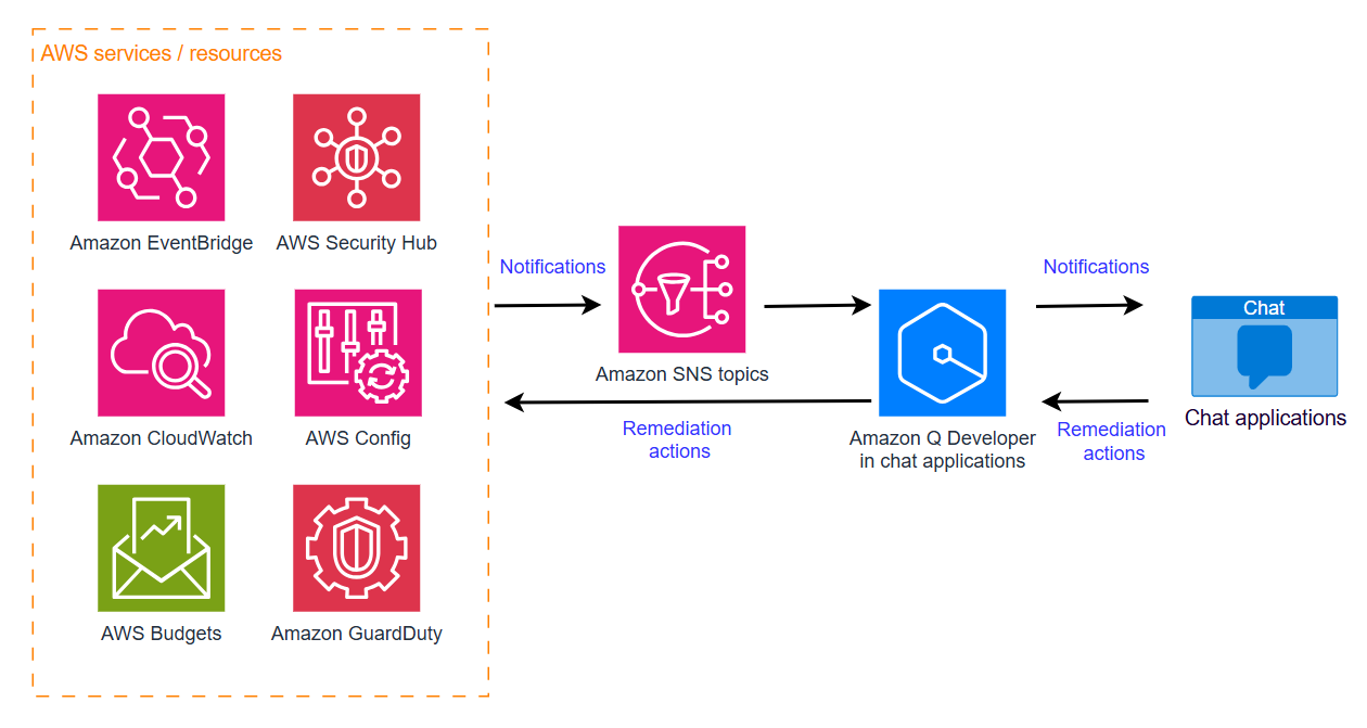 By using Amazon Q Developer, you can receive AWS service notifications directly in your chat channels and leverage natural language interactions to call AWS Application Programming Interfaces (APIs) for investigating and remediating issues. This chat-based approach offers several key advantages: