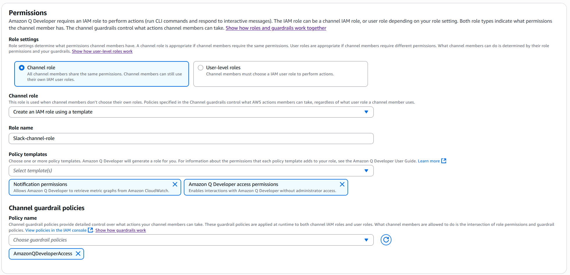 - In Channel guardrail policies, set up channel guardrails to control available actions. Add the AmazonQDeveloperAccess managed policy as a guardrail. This enables natural language interactions with Amazon Q Developer. Your channel members can then ask questions and get AI-powered assistance directly in the Slack channel. The following figure shows a sample configuration where a channel role is created using policy templates, and channel guardrails are set up with the AmazonQDeveloperAccess policy to enable AI-powered assistance in the Slack channel.