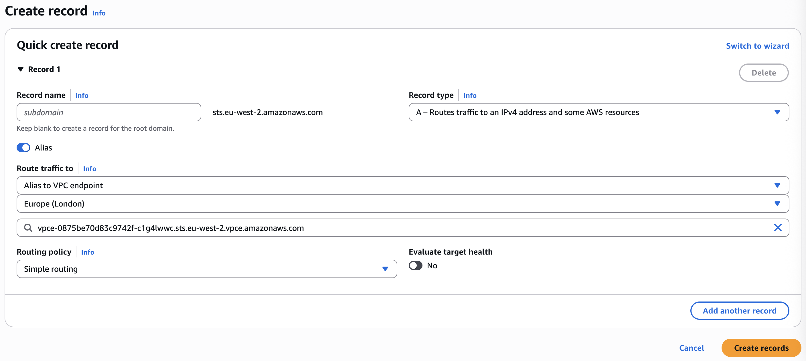 Follow the steps as described in the Create alias record in AWS STS hosted zone section under Step 2: Create AWS STS Route 53 private hosted zone and an alias record in recovery Account. When choosing the hosted zone, choose the hosted zone with the name sts.eu-west-1.amazonaws.com