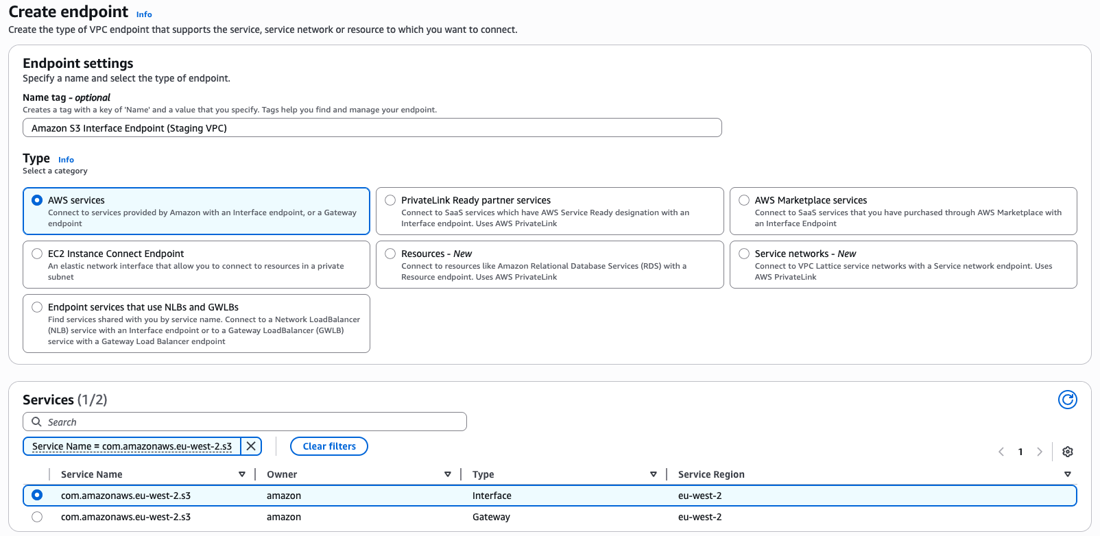 - Provide a name to the endpoint. As shown in the following figure 2, when creating the Amazon S3 interface endpoint in staging VPC, use a descriptive name such as “Amazon S3 Interface Endpoint (Staging VPC)” to clearly distinguish it from endpoints in other VPCs, such as your recovery VPC. You can apply this same naming convention to other endpoints that you create throughout this walkthrough for better organization and identification.