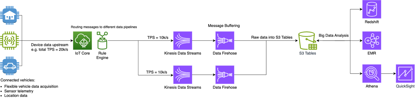 In the scenarios for smart devices and connected vehicles, concurrent publish requests can reach 100,000s or even higher. Furthermore, these messages often need different routing destinations. To handle this efficiently, you can create separate Kinesis Data Streams and Data Firehose delivery streams for different data pipelines, as shown in the preceding architecture. Then, repeat the steps in Section 2.