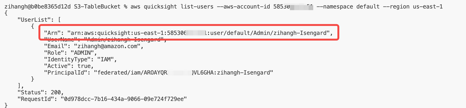 B. List the users of Quick Sight with AWS CLI as shown in the following (replace with your AWS Region and AWS account ID):aws quicksight list-users --aws-account-id 5853xxxxx --namespace default --region us-xxxx-xRecord the user ARN from the response, as shown in the following figure.