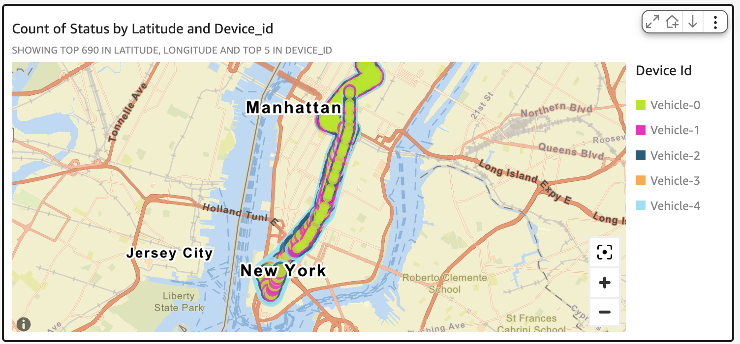 E. Finally, finish the geospatial visualization in Quick Sight with simulated vehicle data from AWS IoT Core and S3 Tables. The sample dashboard is shown in the following figure.