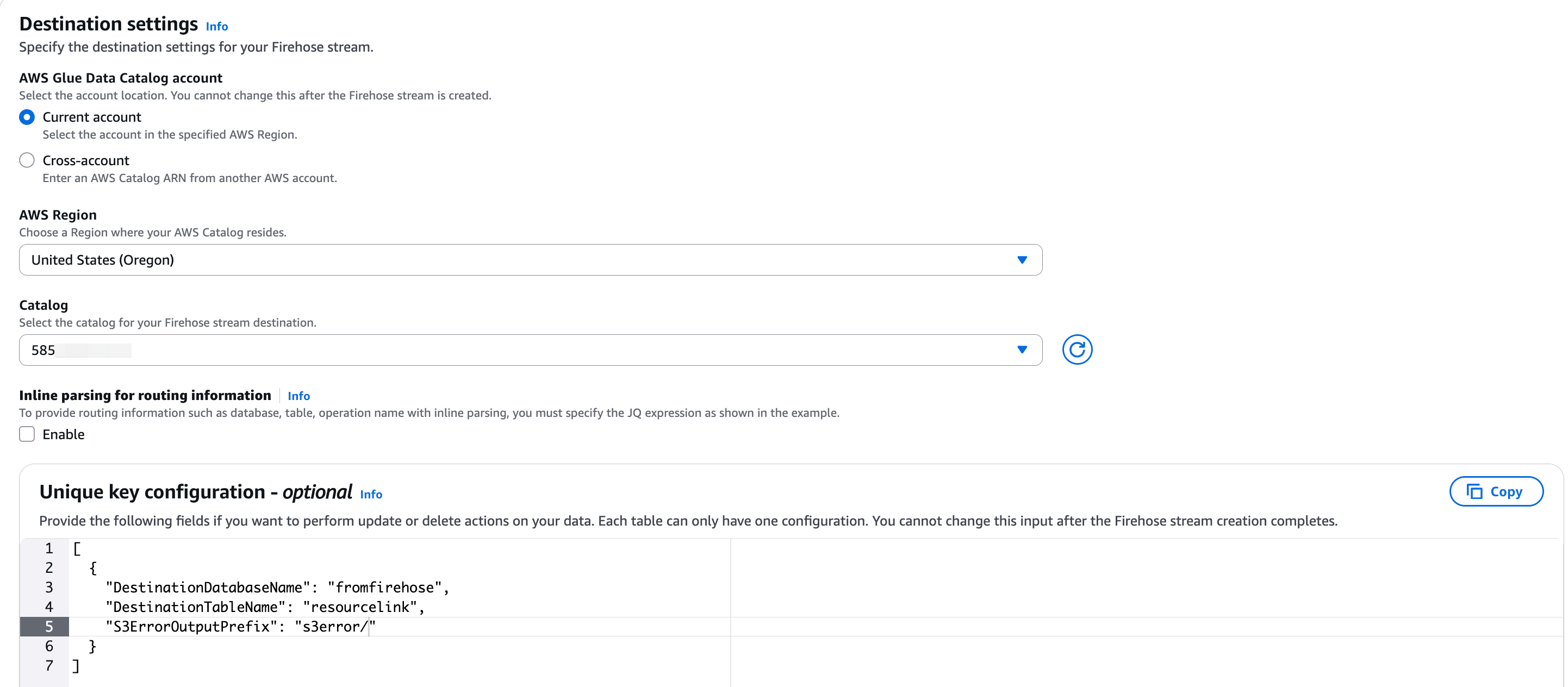 - Kinesis data stream: “arn:aws:kinesis:us-xxxx-x:5853xxxxx:stream/kds_for_firehose”.