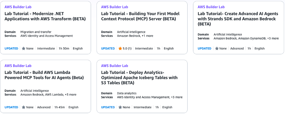 Are you ready to take your AWS skills to the next level with complete control over your learning environment? We’re excited to announce the beta release of the new set of Lab Tutorials on AWS Skill Builder. This innovative learning experience allows you to build comprehensive cloud solutions in your own AWS account, while following expert guidance from AWS subject matter experts through the integrated learning platform on AWS Skill Builder.We’re providing five cutting-edge generative AI and agentic AI projects that combine the flexibility of working in your own AWS environment with structured learning paths. With this new approach you can create portfolio-worthy implementations while developing practical skills with the latest AWS services.