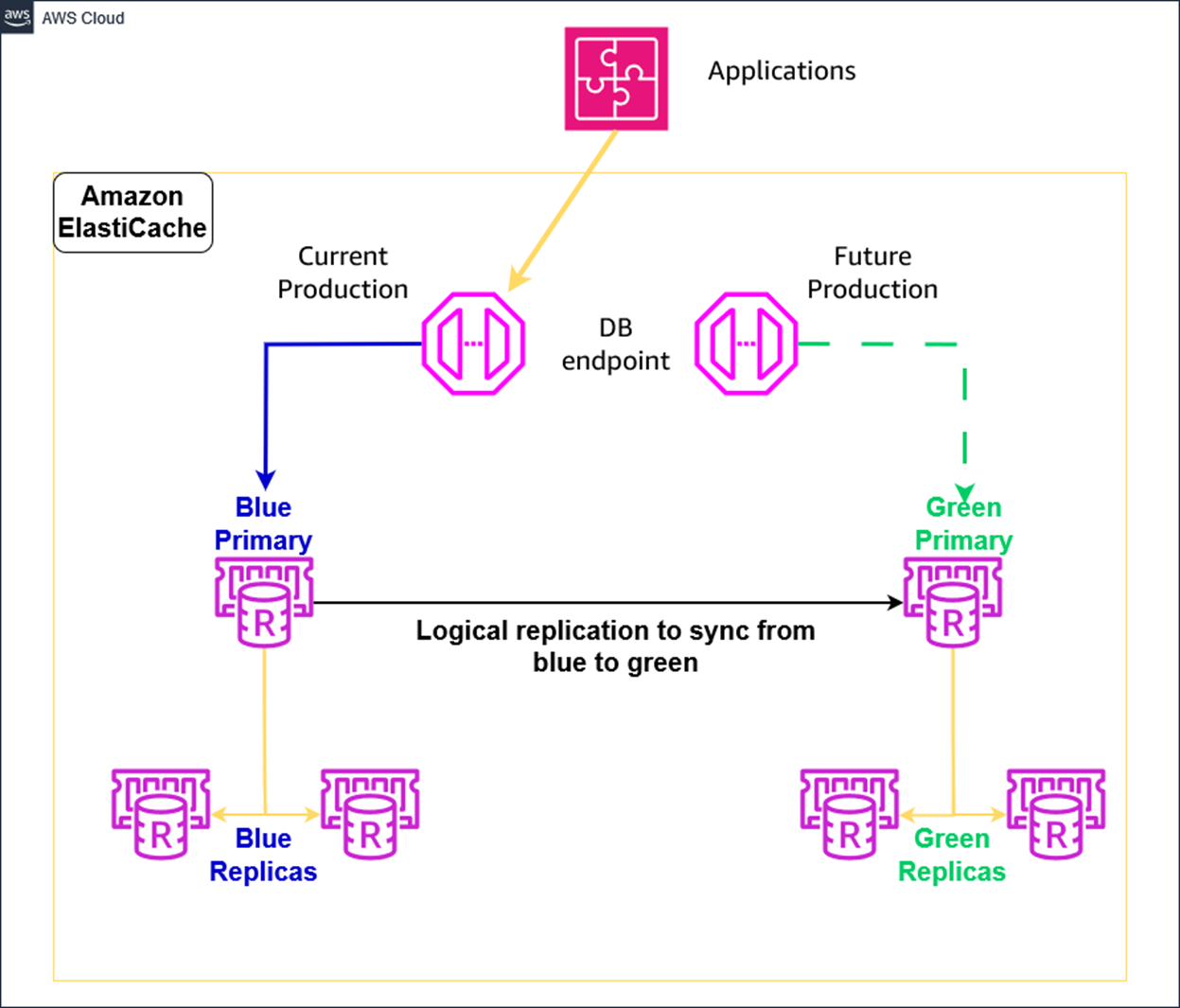 - 绿色集群:新 ElastiCache for Redis OSS 集群(新版本),地址是redis-green.abcdef.ng.0001.use1.cache.amazonaws.com:6379