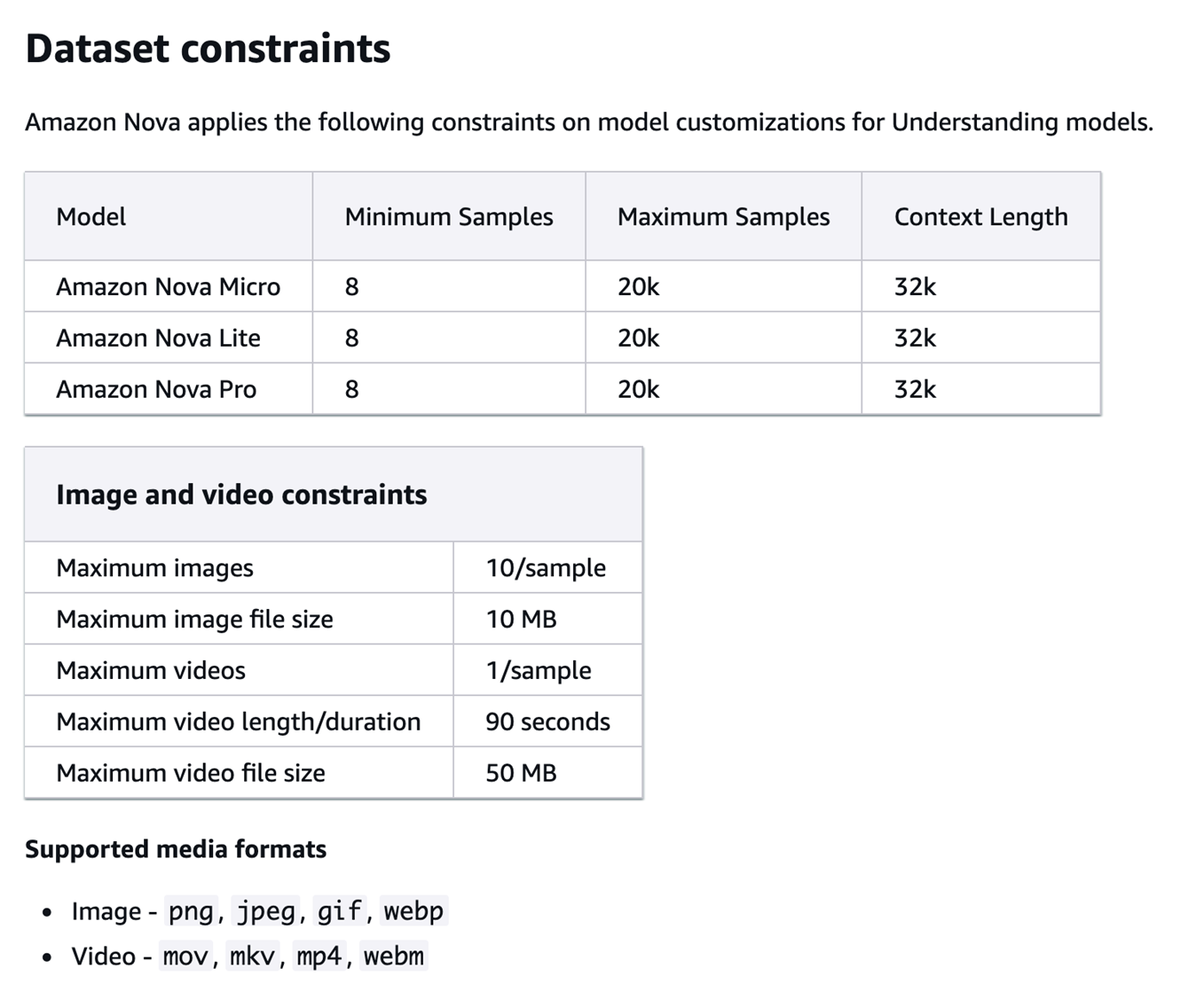 - 不支持对已微调的 Nova Lite 模型进行二次微调