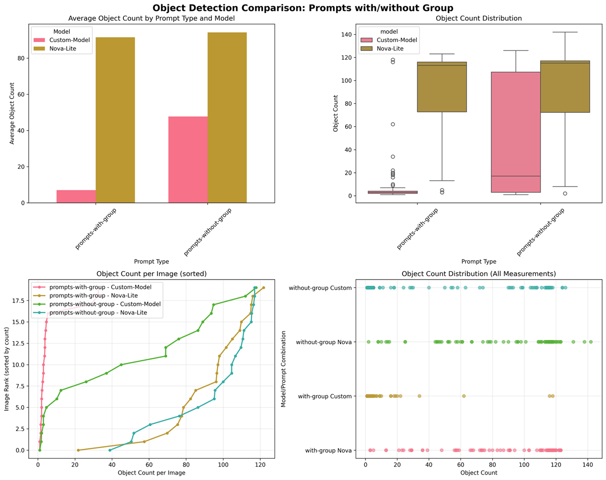 - Nova-Lite 明显过度检测:两种提示词类型下均超过 90 个检测框