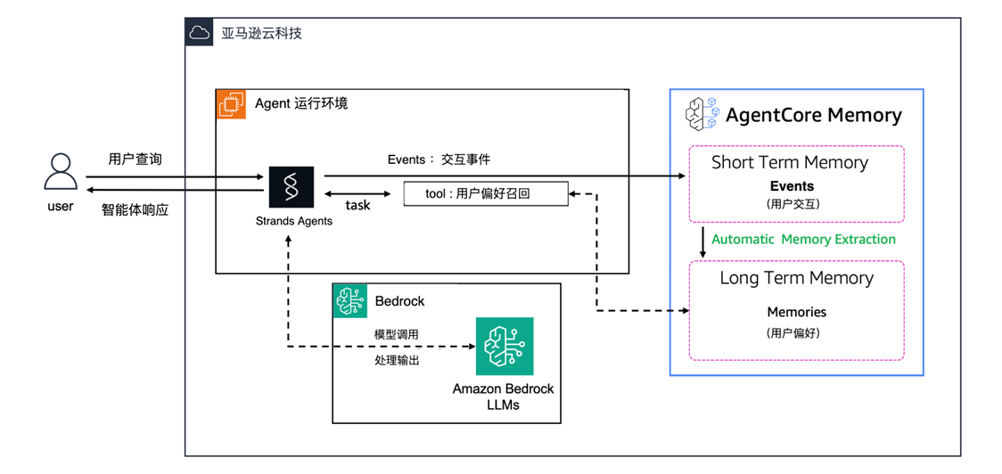 - 记忆融合 – 基于 Strands Agents 调用 AgentCore Memory 中的用户历史数据,对各 Agent 处理后的结果进行个性化答案整合,确保最终呈现给用户的搜索结果完全符合其独特偏好与需求。