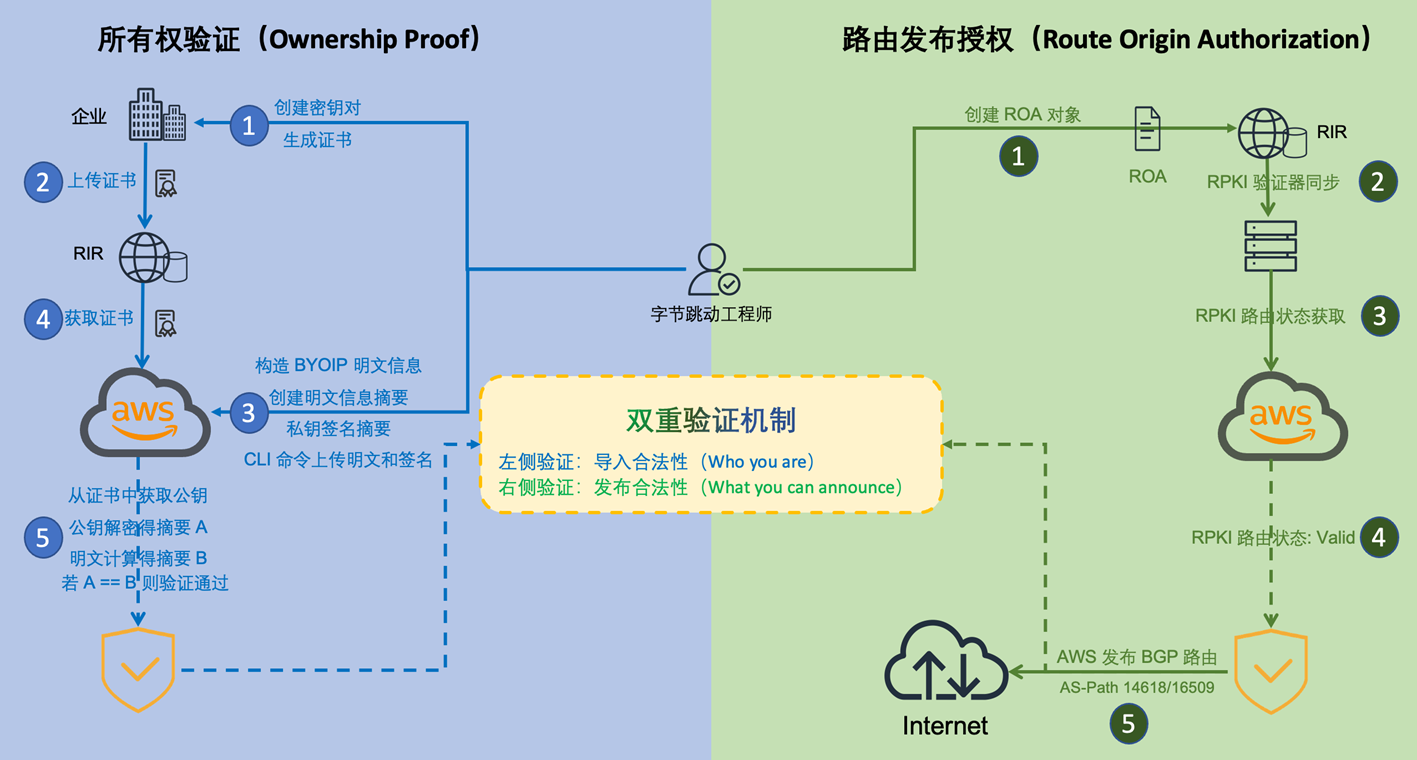 如图所示,AWS BYOIP 的安全性建立在两个相互独立但互补的验证机制之上:所有权验证(图左侧蓝色部分)和路由发布授权验证(图右侧绿色部分)。接下来,我们将分别介绍这两个验证机制的工作流程。