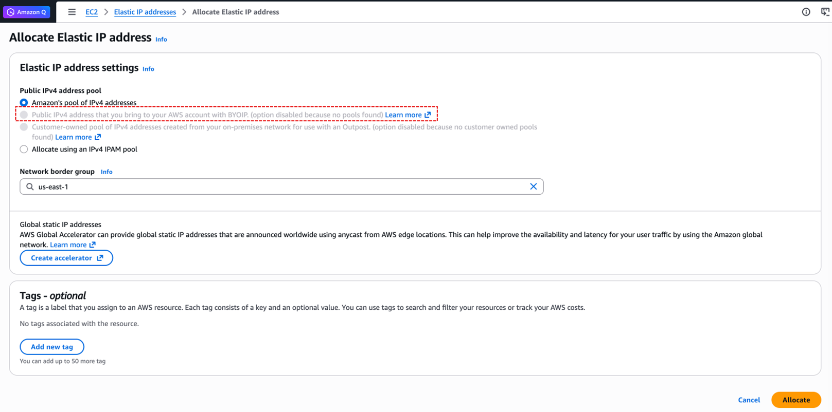 IP 地址段成功 Provision 和 Advertise 后,可以从该地址池中分配弹性 IP 地址(EIP)。在 AWS 控制台或 CLI 中分配 EIP 时,需要在”Public IPv4 address pool”选项中选择”Public IPv4 address that you bring to your AWS account with BYOIP”类型。
