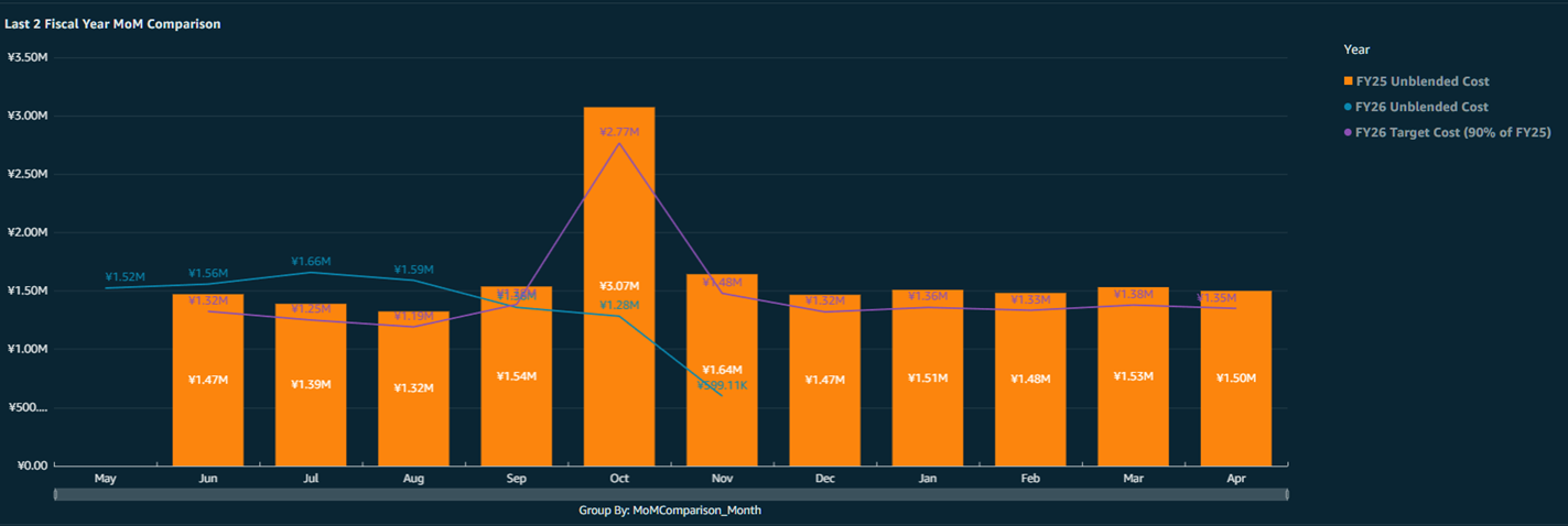 本文以实际项目实践为例,介绍如何在标准 AWS CID 的基础上,通过 Athena 视图、账户映射表、QuickSight 计算字段和自定义图表,实现财年视角的成本对比分析,以及「以 FY25 为基准,FY26 目标成本为 90%」的精细化成本治理方案,帮助业务和财务团队在一个统一的仪表盘上对齐目标、跟踪偏差和驱动优化行动。