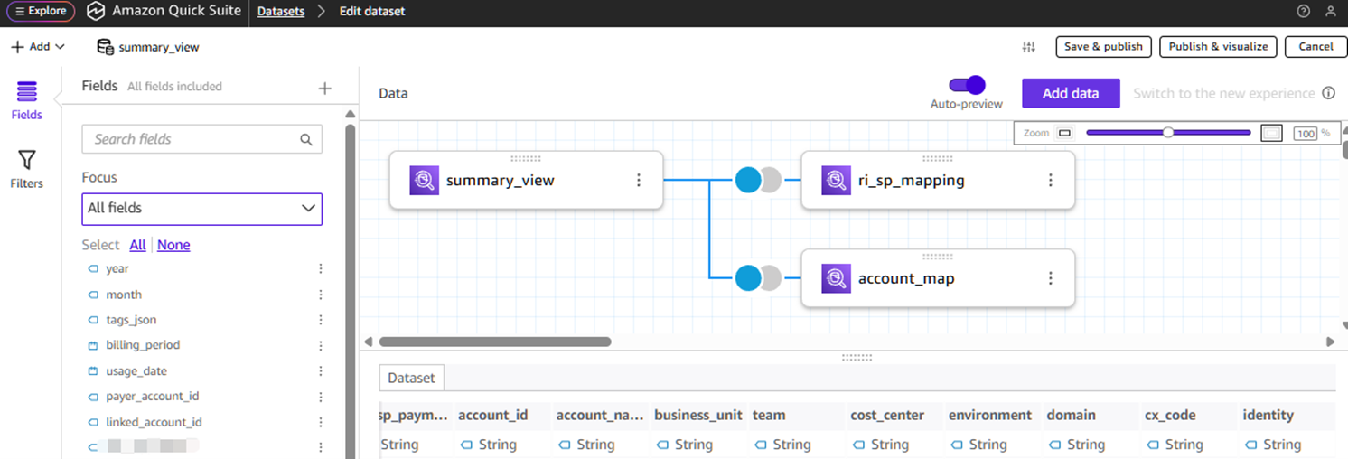 通过在QuickSight 的数据集层面将 cost_weekly 与 account_map 进行关联,我们就可以在任何 Dashboard(CUDOS、CID、KPI 或自定义仪表盘)中用业务语言进行分析,而不仅仅是「账号 ID」。这种基于 CSV 的映射方法具有很强的通用性和灵活性,可以在多个仪表盘间复用。