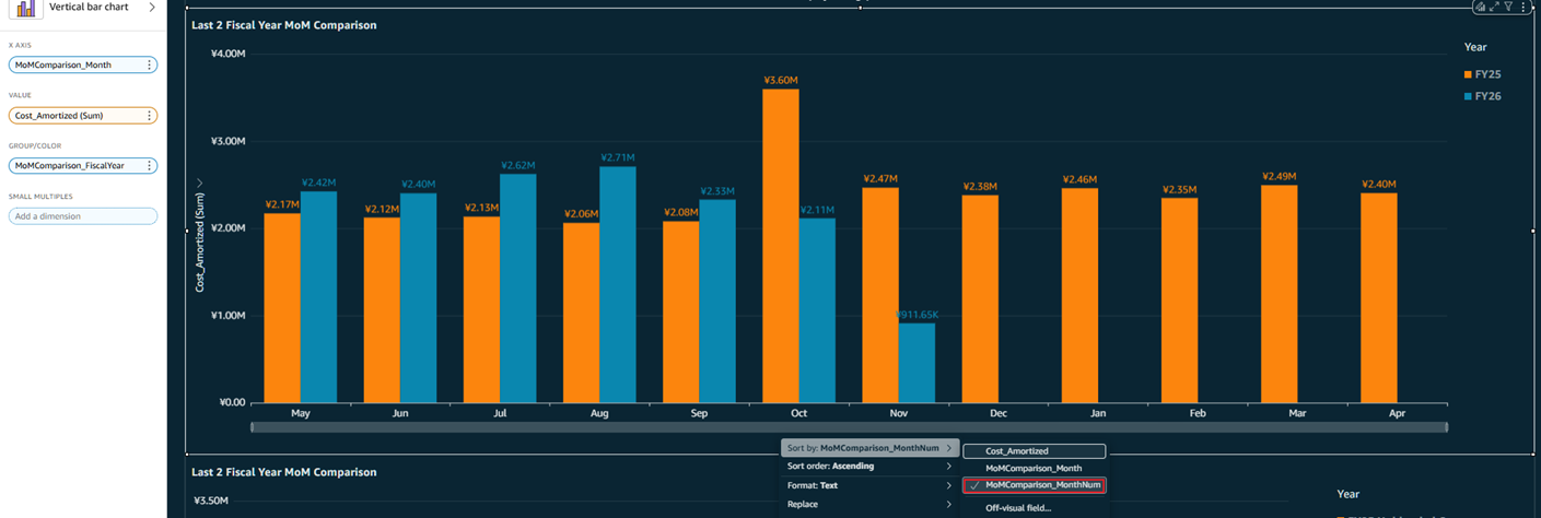 由于客户的财年从每年 5 月开始,我们需要在 QuickSight 中构建一个自定义财年字段 MoMComparison_FiscalYear,同时还需要用于展示与排序的月份字段。