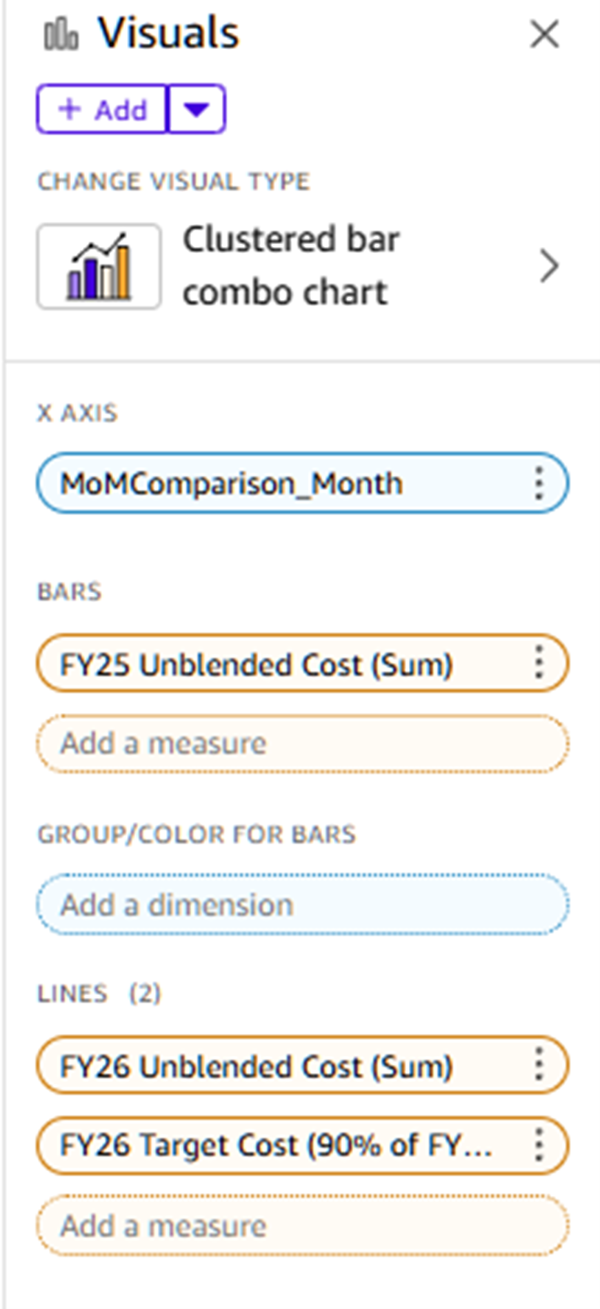 在完成计算字段配置后,我们可以在现有的 AWS Cloud Intelligence Dashboards(如 CUDOS、CID 等)中创建或克隆一个视图,并按如下步骤构建高级对比图表。这个方法不局限于特定 Dashboard,可以根据实际需求灵活应用。