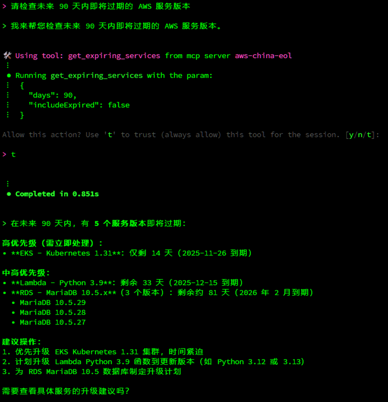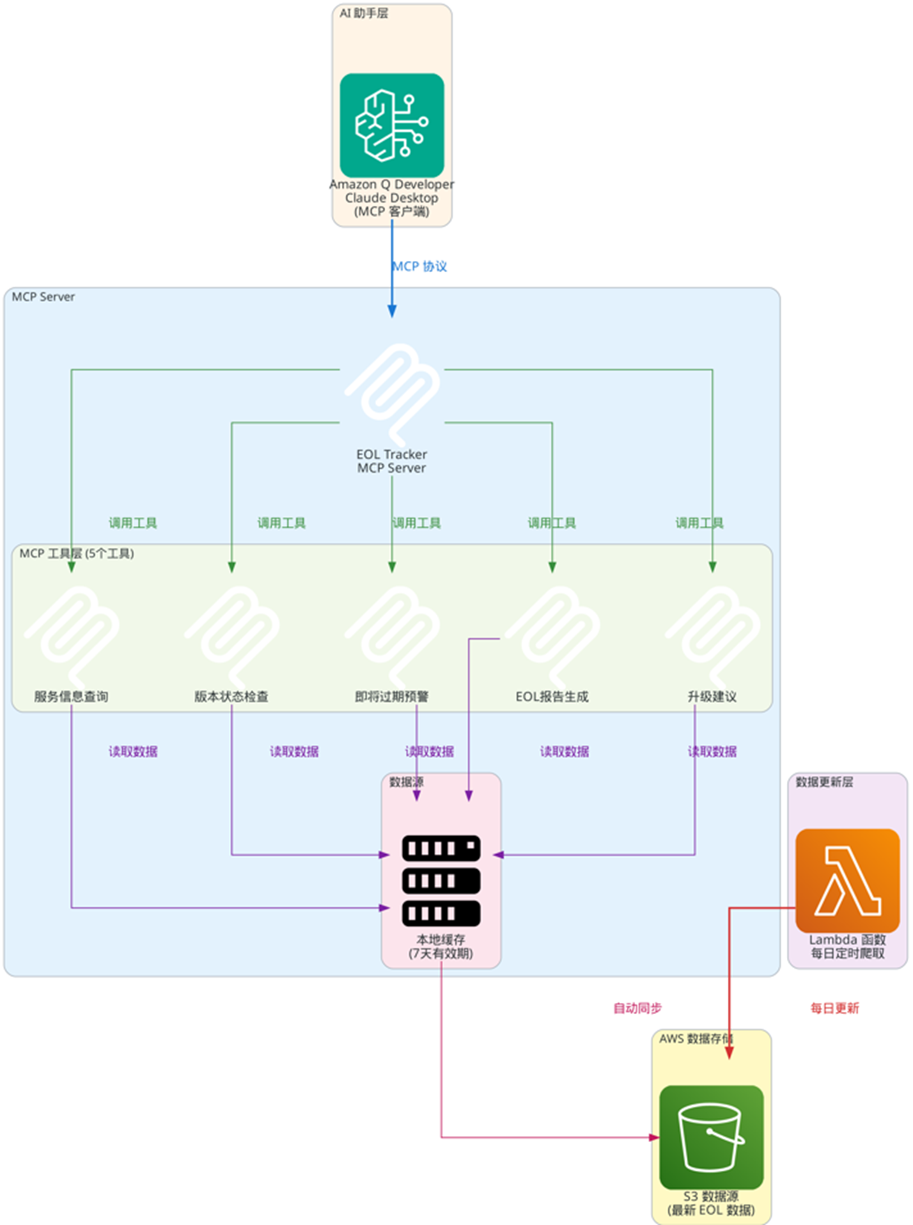 为了解决这些痛点,我们构建了一套基于 MCP(Model Context Protocol,模型上下文协议)的自动化 EOL 追踪方案,将版本生命周期管理能力直接集成到 Amazon Q Developer 等 AI 助手中,通过自然语言对话实现主动的基础设施管理。