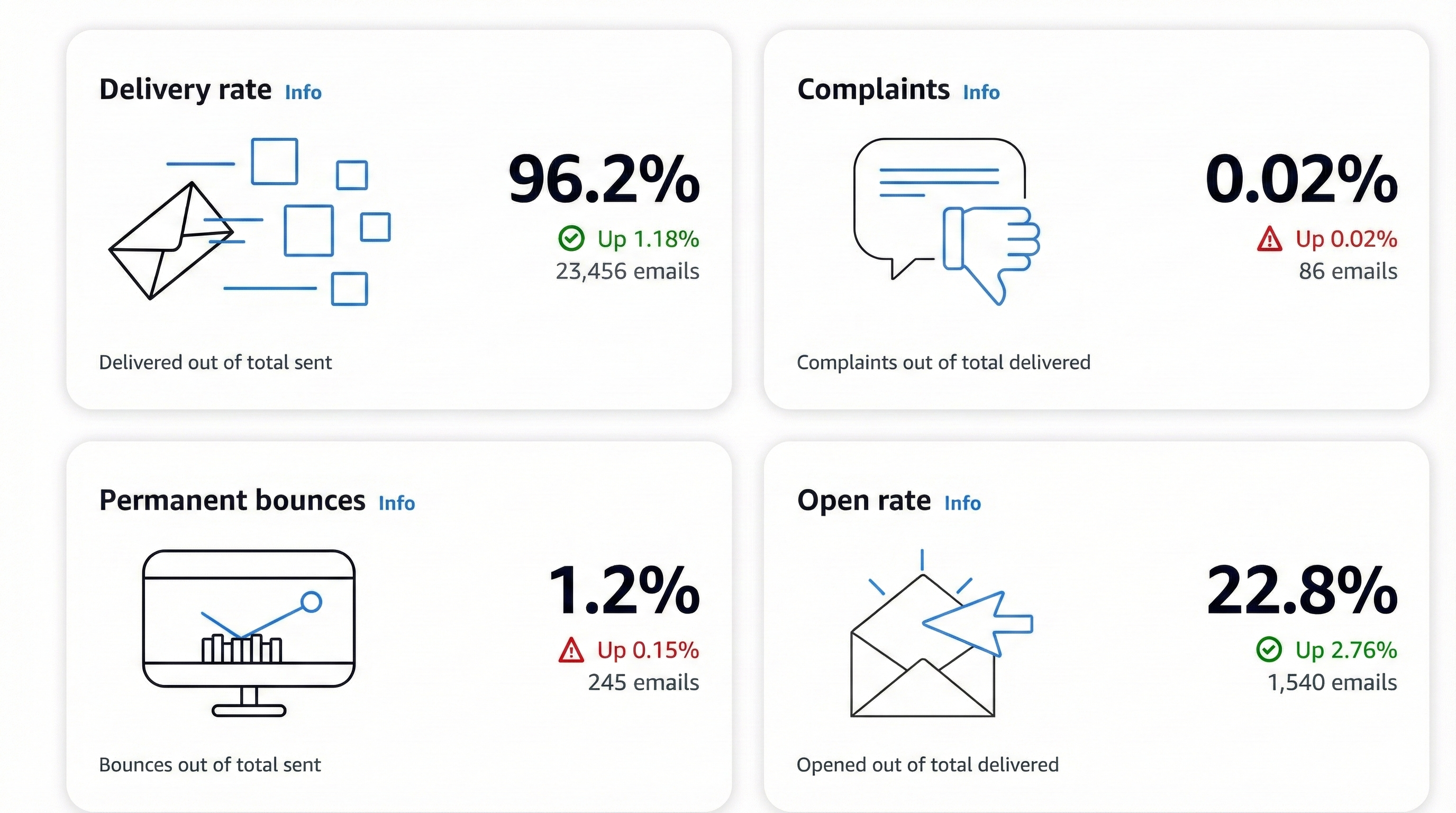 - ISP 数据:分析不同 ISP 的送达情况(Gmail 95%、Outlook 92% 等)
