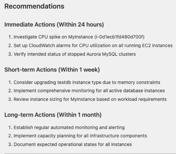 最后编排Agent对上述检查结果进行统一整理和分析, 并给出行动建议, 非常详尽, 对于查找的问题, 可以添加其他的Tools, 如slack tool, 将巡检报告以及查找的问题发送到对应的Channel, 实现告警通知.