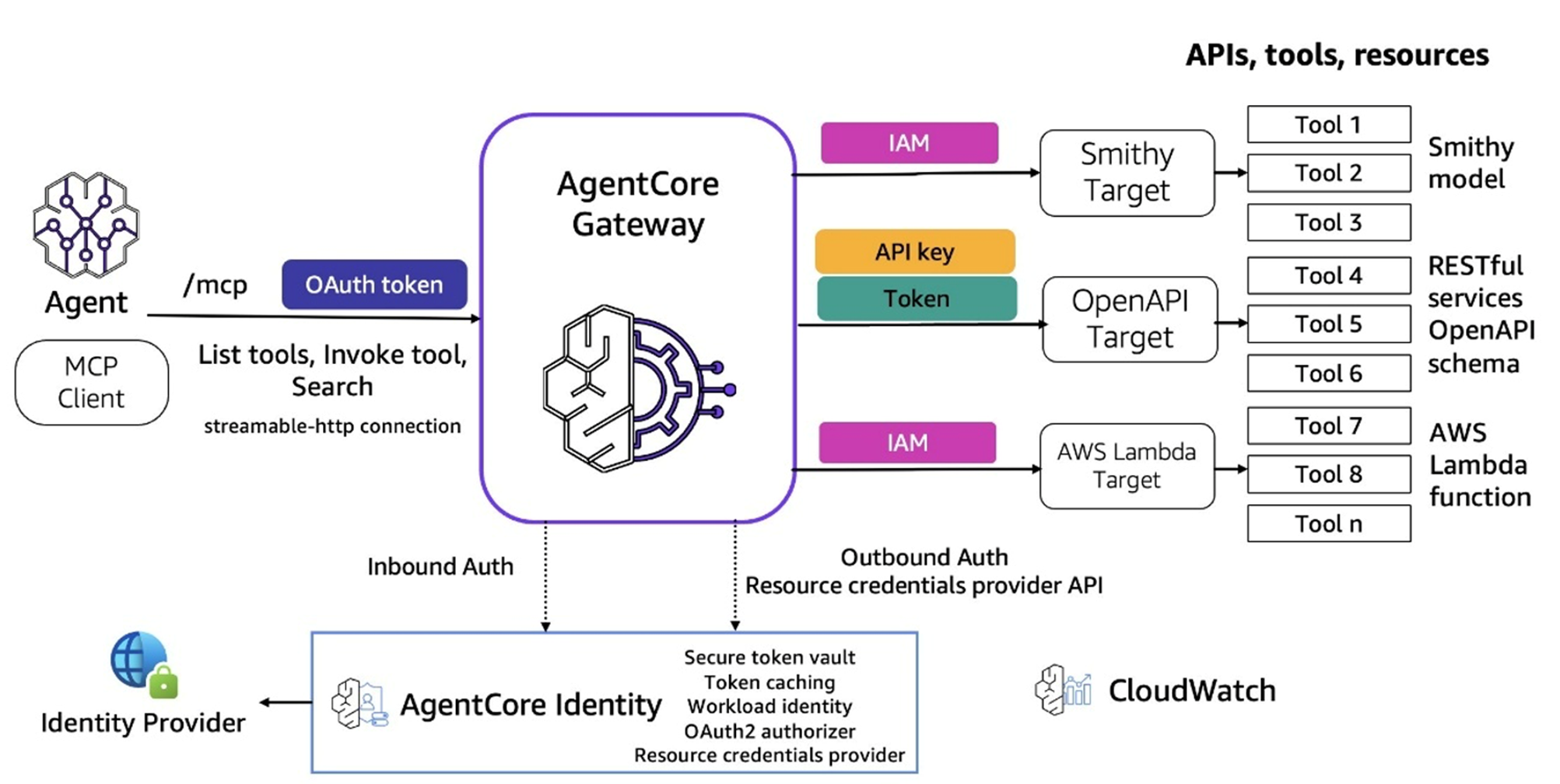 单个Gateway可以附加多个Target,且可以在任意时候修改Gateway所附加的Target/Tool。每个Target都可单独绑定Credential Provider:无论Target需要 IAM 凭证、API 密钥还是OAuth凭证,都能通过这种方式实现安全访问。