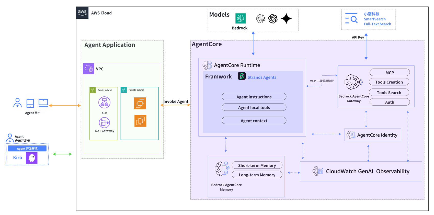 基于Amazon Bedrock AgentCore在打造强大Agentic Agent过程中可以免除繁杂的基础设施和运维基础工作,并可以灵活的框架选择及安全、可扩展且可靠的进行企业级Agent部署的优势,本次Agent Infra集成共涉及AgentCore多个模块,包括: AgentCore Runtime、AgentCore Memory、AgentCore Gateway等模块