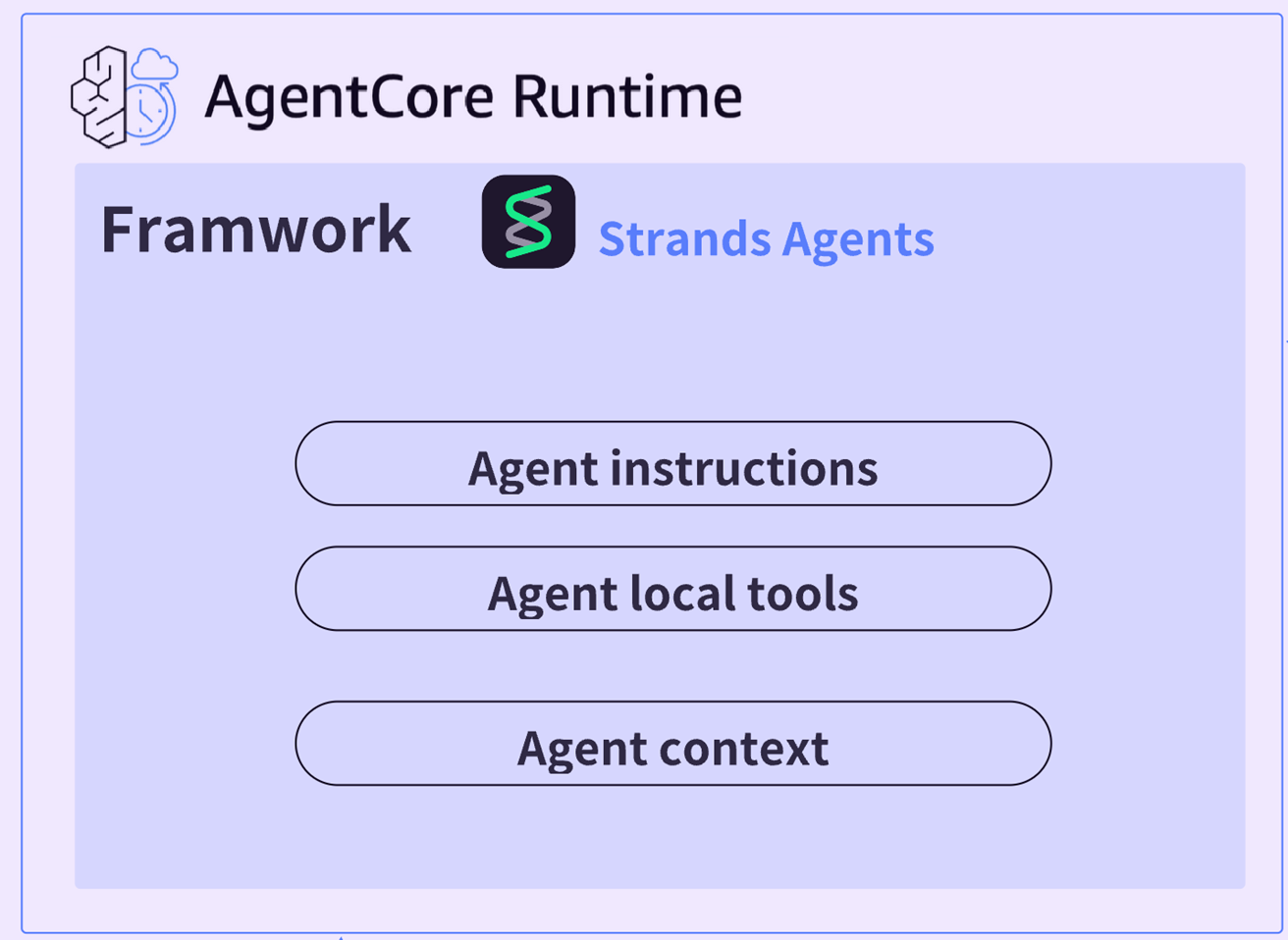 本次选择Strands Agents作为agent开发框架,其中Agent逻辑代码、本地tools及Agent上下文相关组件全部部署在AgentCore Runtime中。