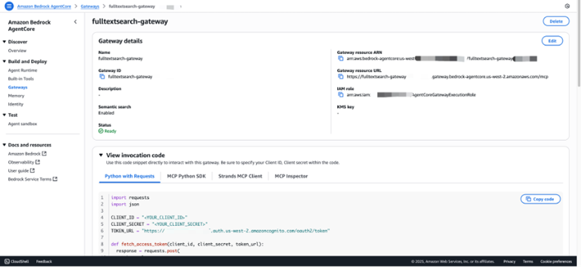 我们可以通过控制台上提供的调用代码示例将Gateway集成到我们的Agent应用中,AgentCore Gateway支持Python with Requests、MCP Python SDK、Strands MCP Client、MCP Inspector等调用方式。