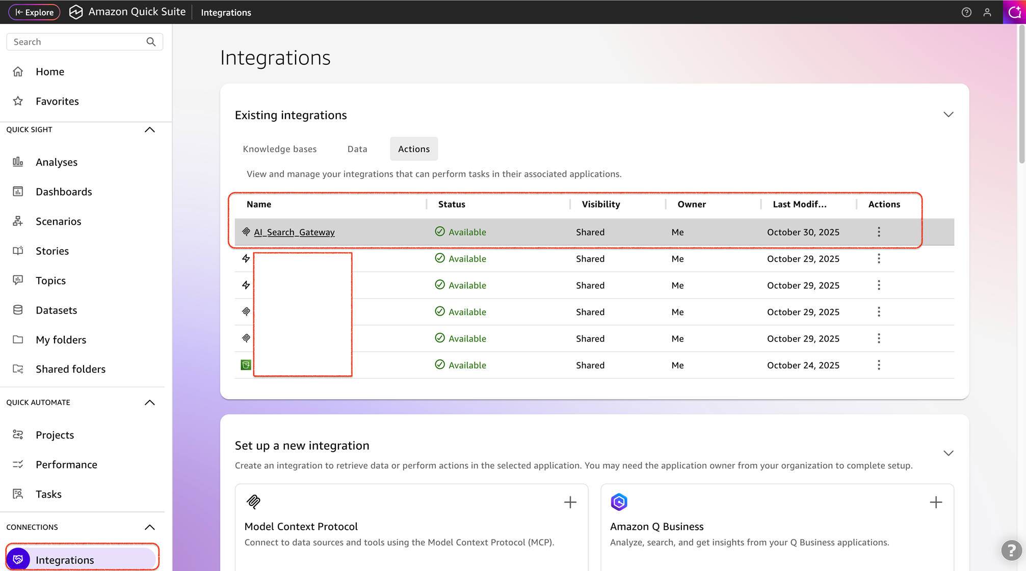 - 在Quick Suite控制台中配置MCP Integration,指向AgentCore Gateway端点
