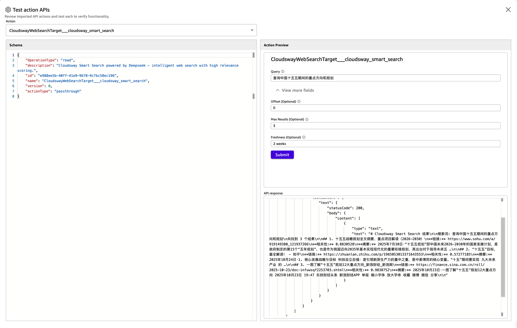 例如:用户在Quick Suite的Chat Agent中可以直接使用Cloudsway智能搜索获取实时新闻、技术文档等信息,提升信息获取效率。