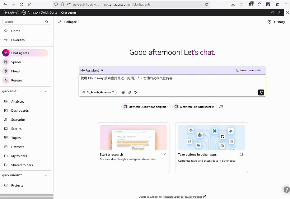 - 在Quick Suite的Chat Agent中直接使用Cloudsway智能搜索工具