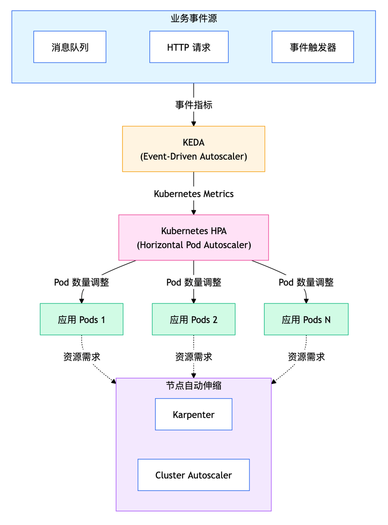 • 如果希望兼顾资源指标(如 CPU/Memory)和事件指标伸缩,可以考虑优先使用 KEDA 内置的相关触发器,而不是将 HPA 单独配置为另一套伸缩逻辑。