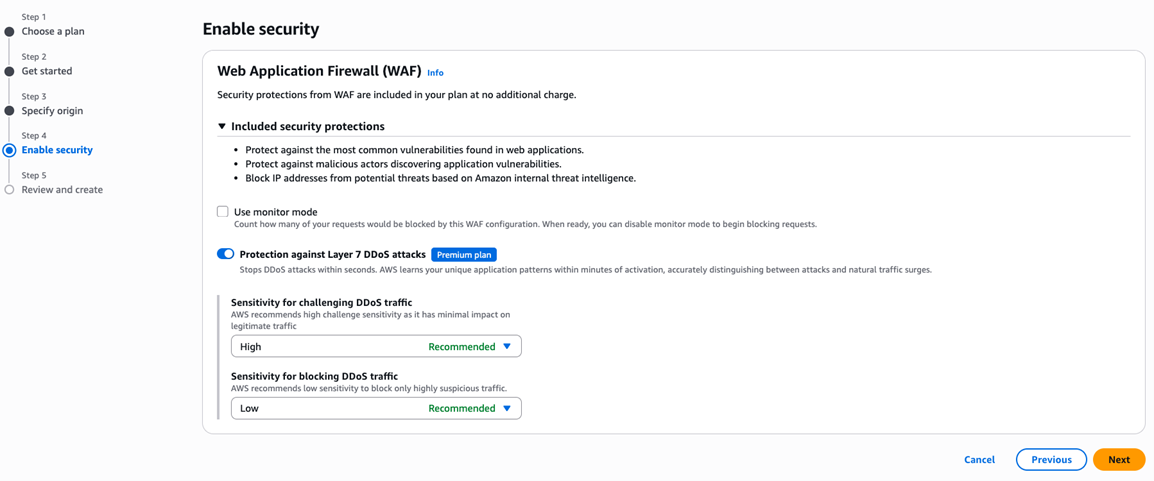 对于需要更强安全性的业务应用,从 Business($200/月)级别起即可获得应用层(L7)DDoS 防护能力,依托 AWS WAF 的规则引擎实现高级恶意流量识别、威胁拦截与异常行为检测,有效缓解面向应用的攻击压力。借助 CloudFront 全球分布式边缘架构,用户无需额外购买独立高防产品,即可在访问入口处实现始终在线、自动扩展的企业级防护。