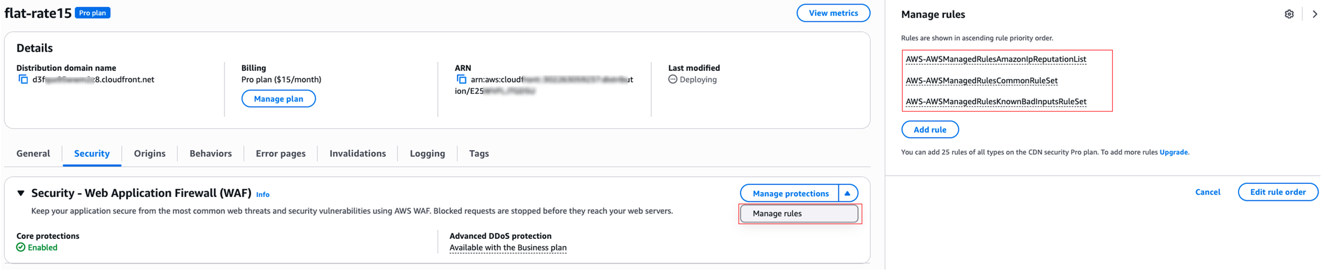 IpReputationList,CommonRuleSet,KnownBadInputsRuleSet 这三个WAF托管规则,已经在创建Flat-rate的CloudFront分发时配置好了,如果选择Business套餐及以上,DDoS的防护功能也已经在创建步骤中配置。查看位置:CloudFront Distribution-> Security tab -> Manage protection -> 下拉框点击Manage Rule,如下图: