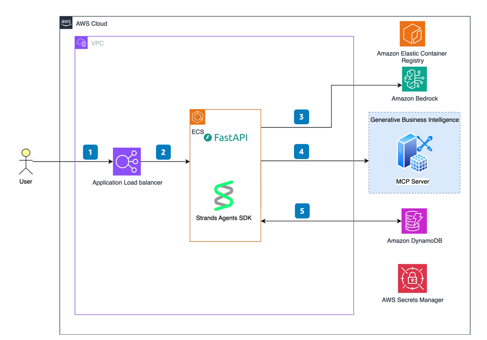 - 容器化应用服务层:ECS容器服务承载基于FastAPI框架的Web应用,该应用同时支持RESTful API和SSE长连接通信。SSE长连接的设计解决了生成式商业智能系统执行复杂分析任务时可能出现的HTTP超时问题。应用集成Strands Agents SDK,支持运行时动态创建和配置Bedrock Agent。