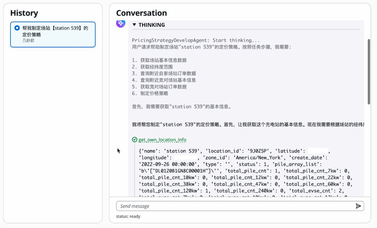 为了更好地展示系统的实际应用效果,我们以制定某充电站的定价策略为例,演示完整的智能定价策略制定流程。当用户通过自然语言输入”帮我制定站点某充电站的定价策略”时,该解决方案立即启动多步骤分析流程。该方案首先进行任务拆解,如获取场站基本信息数据、获取经纬度范围等,然后通过Generative BI工具针对每一个字任务进行数据查询。