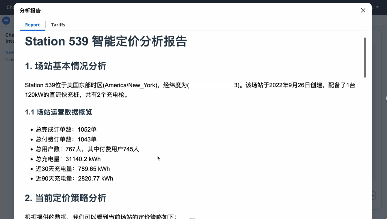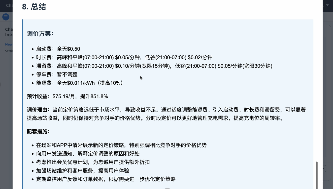 基于收集到的多维度数据,系统生成了一份详尽的智能定价分析报告。该报告展示站点的地理位置特征、历史使用模式、设备状态、电力成本变化等多个维度的信息。通过大模型识别用户行为规律,预测不同时段的需求波动,并结合外部市场因素进行风险评估。这一过程体现了Agentic AI的核心优势——能够处理人类难以同时考虑的多重复杂因素。