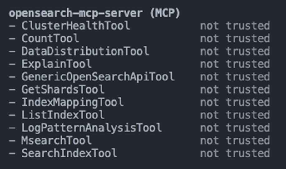 输入命令 kiro-cli,如果配置正确, opensearch-mcp-server 会被正常加载。进入 kiro cli 之后,通过命令 /tools 查看它的 tool,在 opensearch-mcp-server (MCP) 下看到如下的显示,就说明所有 Tool 已经被加载了。
